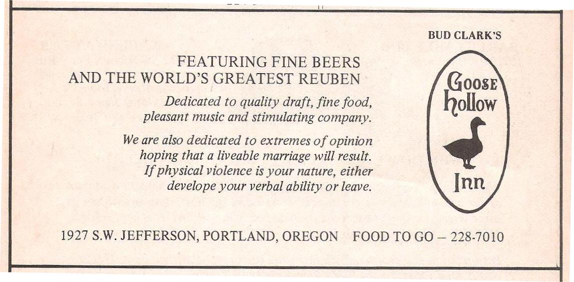 Published in 1983, the booklet listed a total of 15 restaurants and pubs in the greater Portland area [including one in Vancouver] serving beers on tap that didn’t exclusively serve the usual American swill [Bud, Miller, etc.] of the day. Most served German and UK beers, Canadian [Molson Golden – bleccchh], Red Hook, Sierra Nevada Pale Ale and River City Gold straight out of Sacramento. Flipping through the guide I didn’t see many Portland breweries represented because, well, there weren’t that many. One exception was Henry Weinhard’s Private Reserve which was listed under the Special Brews from the New World section. So was Michelob. Of course McMenamin’s was formulating its juggernaut brew biz off the ground with its pub in Hillsboro.