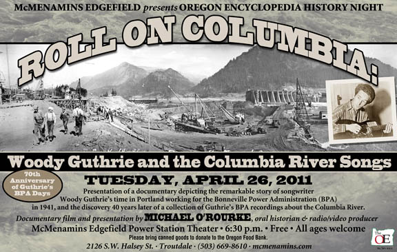 In the mid-1980s, BPA employee Bill Murlin rediscovered Guthrie’s Columbia River songs and worked with oral historian and producer Michael O’Rourke to create a radio documentary for OPB, broadcasting many of the songs for the first time. O’Rourke turned this radio documentary into a film, including interviews with people who knew and worked with Guthrie. That film will be debuted publicly at The Oregon Encyclopedia History Night on Tuesday, April 26, 6:30pm, at the McMenamin’s Edgefield Power Station. Bill Murlin will be on hand to talk about his discovery of the lost songs and to play his guitar.