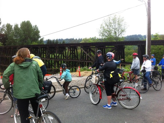 The group met at Milwaukie City Hall (where they meet for each ride) and off we went to the first stop: Kellogg Bridge and lake. Once site of a sawmill and a lake that swam with salmon, the bridge will play an integral part of the light rail. Hopefully a pedestrian bridge can be added, connecting downtown to Island Station. There’s also talk of removing the dam at Kellogg Creek which would be wonderful for many reasons.