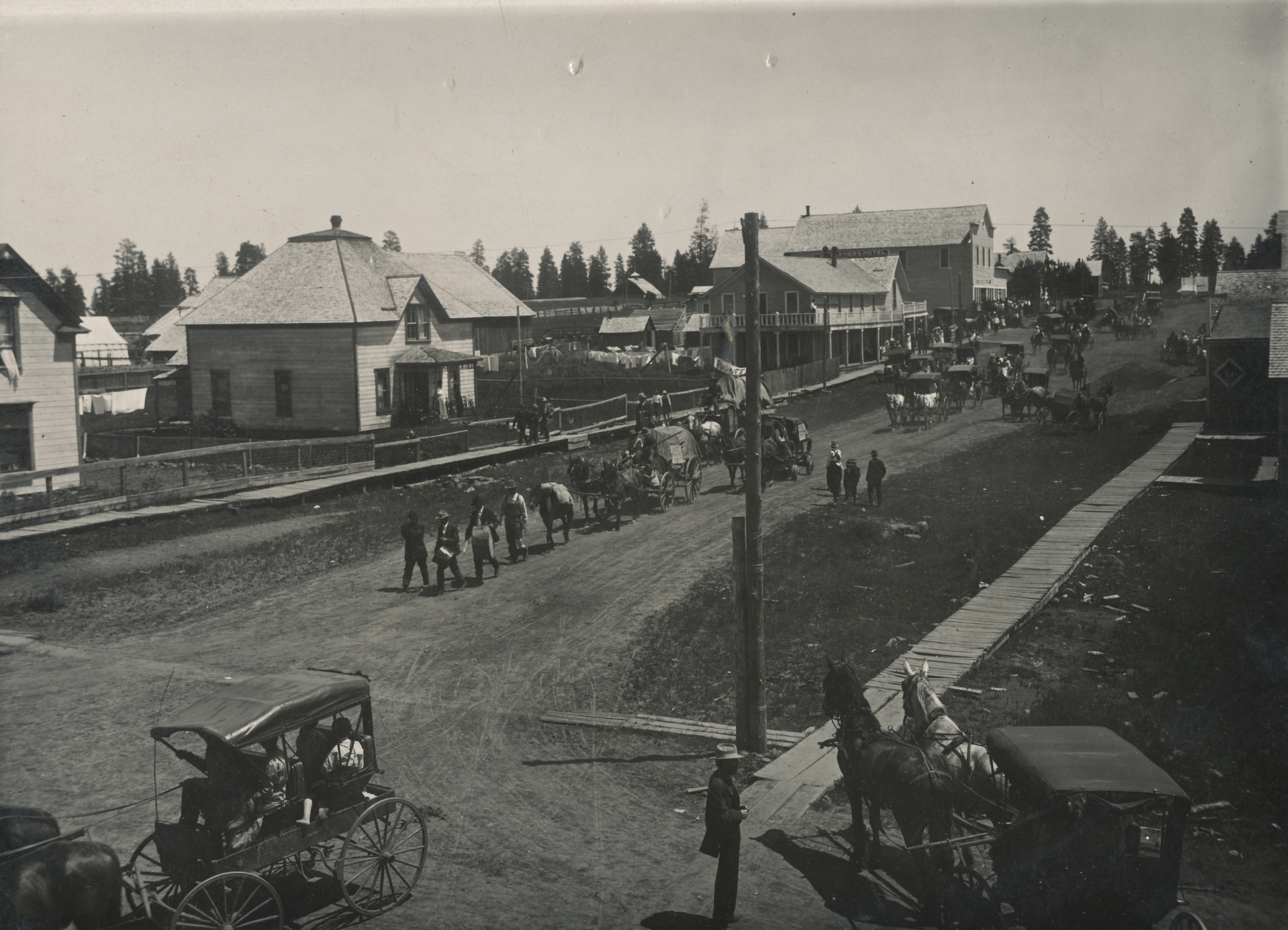 Wow Mike above. I remember when you came out or I talked to you or something for that book! I do not believe I have ever been called lovely. Thank you! The photo is of the 4th of July parade. I think 1904, but Dan (hubby) thinks it is 1910. Cannot find the book where this pix was published. But this picture here is the cleanest version I have seen and I have seen this several times. We own the block that you see in the pix. The Conley House, as it is known, 2nd house in from the left, is in very poor shape but we are still planning on saving it. It actually looks in worse shape than it is. The Clark House, first house on the left corner of the block (left of the Conley) is stablized with a full roof redo but we need to close her up with a few panes of glass. Right now, besides working to restore the school (come help if you can!), we are restoring and remodeling the Curry House on north side of the block (cannot see), the stable for the old hotel on the righthand corner of the block in the pix. We run a B&B out of the Curry