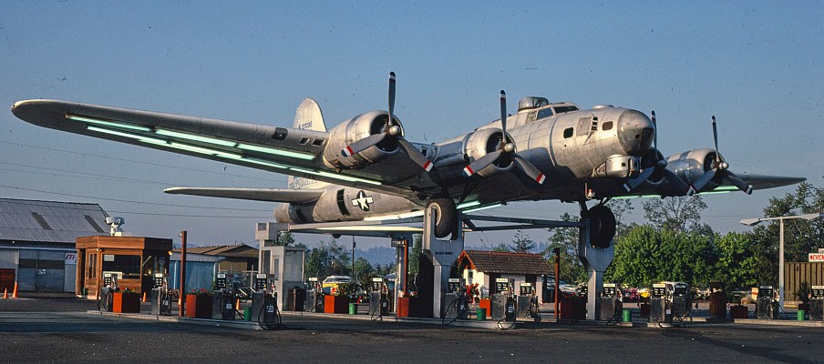 If you don’t know the story, in 1947, Art Lacey purchased a B-17 bomber for $13,000 and flew it from Oklahoma to Oregon. He then disassembled it, transported it covertly, and placed it atop his 48-pump gas station in Oak Grove. Lacey also opened the Bomber Restaurant and motel. The gas station was closed in 1991.