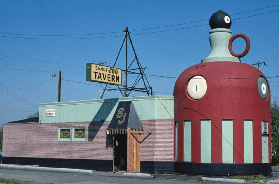 Originally built in the late 1920s, the Sandy Jug building has had many lives, from its original name called The Gusher—a filling station for “motor cars” that offered a refreshment stand for patrons, then a luncheonette (Orange Blossom Jug) and soda shop, back to a bar, and most recently a strip joint.