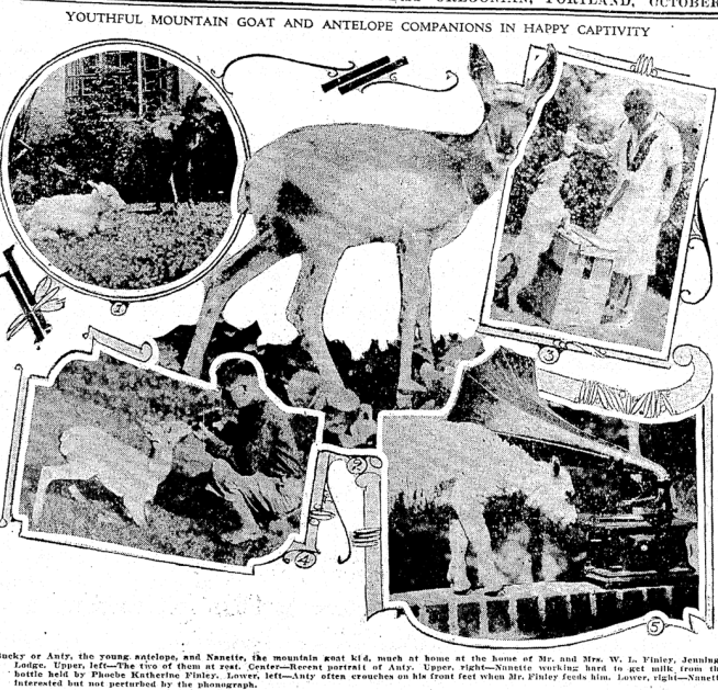 In the October 2, 1927 issue of The Sunday Oregonian, the article, delightfully written and very modern in its style, offered readers a glimpse of the family’s life along the river. In a short feature titled “Antelope and Goat Thrive at Finley’s,” the paper reported that Finley was raising a young antelope and mountain goat together at his Jennings Lodge property. The antelopes were named Anty and Bucky, while the mountain goat was named Nannete, respectively.